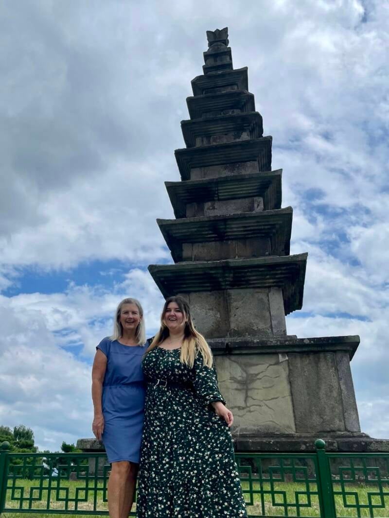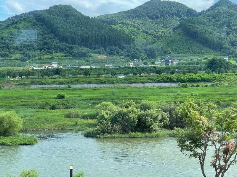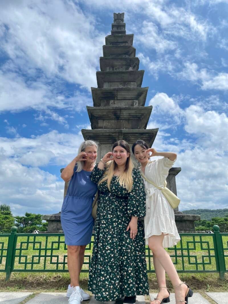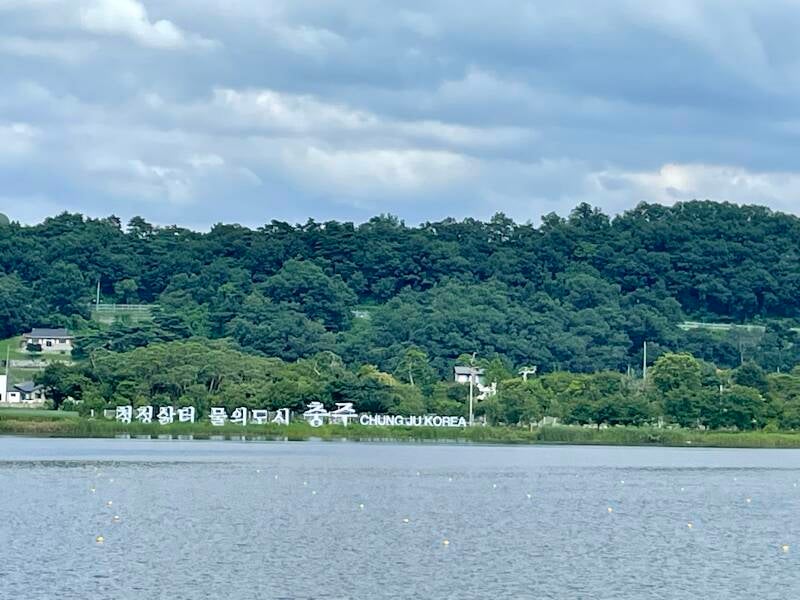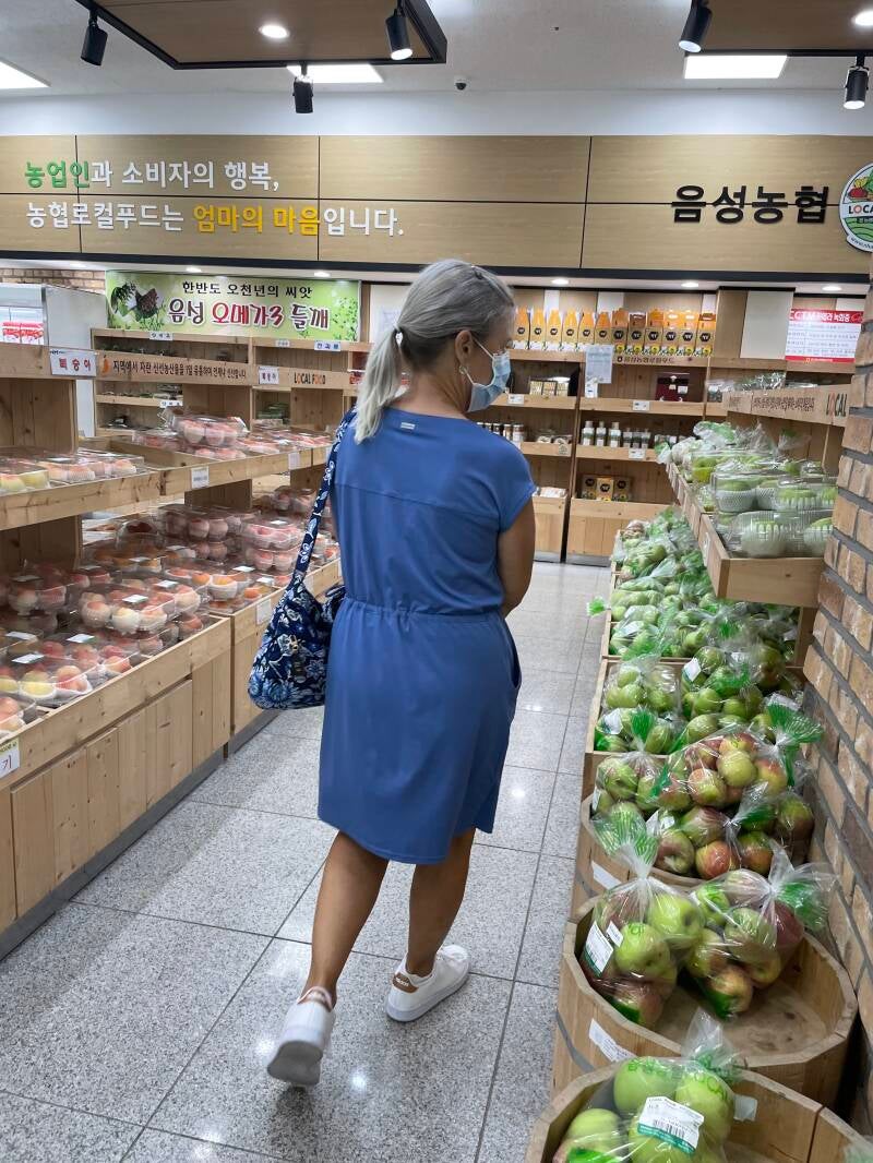 Teachers Hyewon and Guyeol picked us up for a day of adventures in Chungju which began with an authentic Korean meal (막국수 or spicy buckwheat noodles), a visit to Jungangtap Historic Park on the Namhangang River, photos at the Seven-Story Stone Pagoda, and a stroll through the statues. We tasted Makkoli (rice wine) which was sweet and delicious! Thanks to Guyeol for the lovely gift set of Makkoli in a glass decanter with cups to remember my trip and meeting wonderful people. Guyeol is an elementary school teacher and Hyewon teaches special needs students. We relaxed in a cafe where we chatted over drinks and pastries. We ended the day shopping for local peaches in a grocery store.