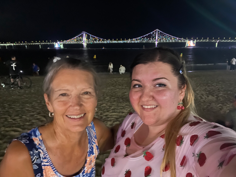 Busan Gwangandaegyo Bridge (부산 광안대교) is beautifully lit at night. We stood on the beach to watch the lights. It is the longest bi-level bridge over the ocean in Korea. Next we went to a Norebang, which is a room for karaoke. It’s very popular in Korea. From there (5th floor) we could sing and watch the bridge lights!