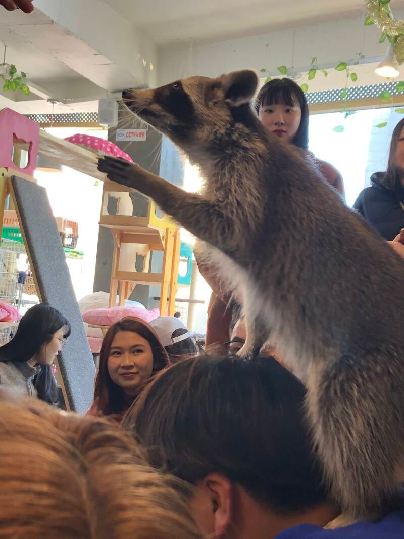 We loved the cat café so much, after breakfast we visited a different animal café that had meerkats, raccoons, wallabies and more! Caroline said this was a must-see, and she was right! The main attraction was a walled-in area, where meerkats could climb all over you.