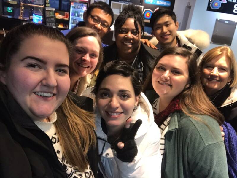 We shared dinner and drinks before moving to the main attraction for the evening - archery! It was funny to see corn on the pizza, but it's quite common there and was delicious. Going around the table from left to right are Caroline, Courtney, me, Cami's date, Cami, Sam, and Sloan.
