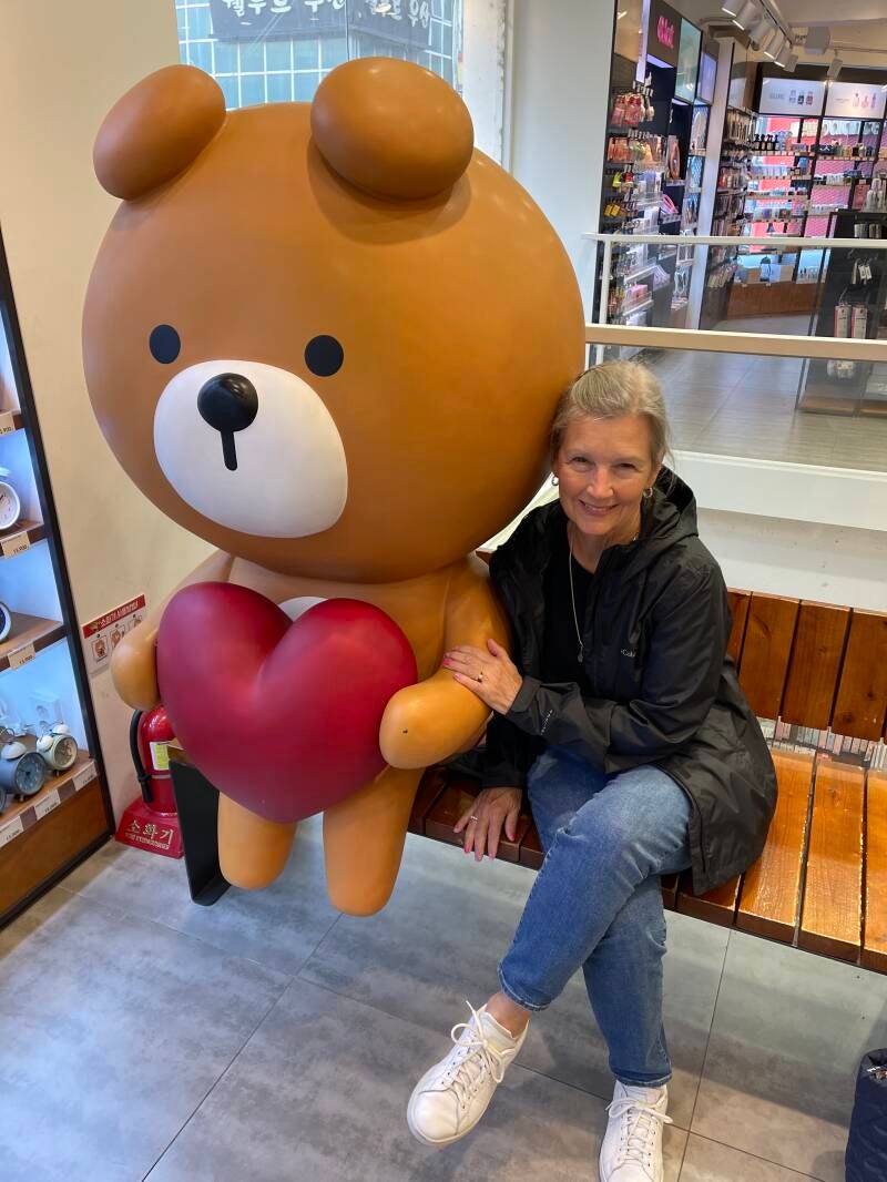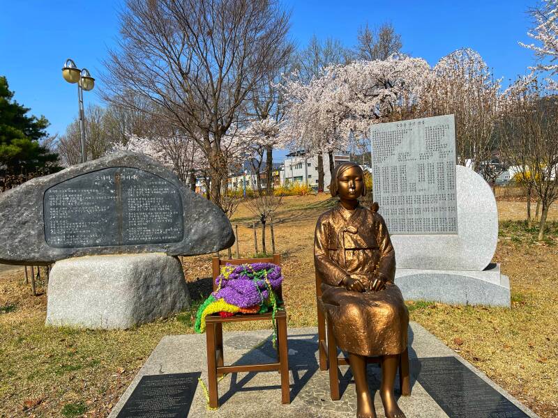 This is a Statue of Peace, sometimes called a Comfort Woman Statue. It represents victims of sexual slavery (comfort women) from when Korea was under Japanese rule. On the chair beside her, someone had made her a blanket to keep warm during winter. It's spring now, so she doesn't need it anymore!