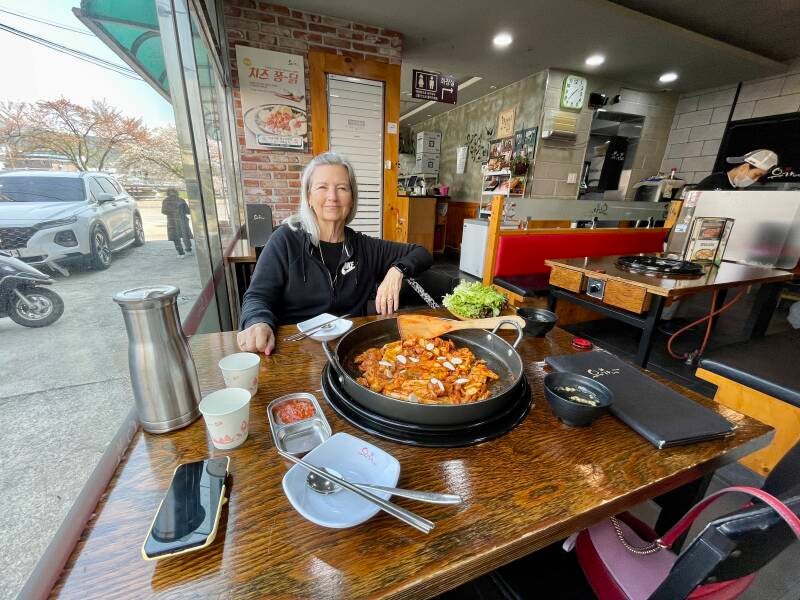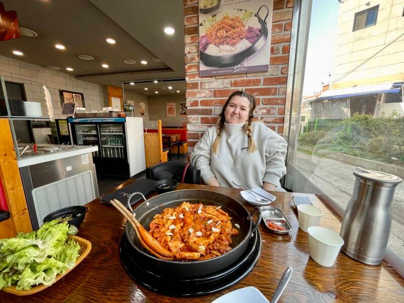 Rick Steves once said, "I’ve learned that eating in Europe is sightseeing for your taste buds." I feel the same way about eating in Korea. Today was a culinary delight! My day started with croffle (croissant waffle), fruit, and café latte. For lunch we took a short bus ride to get spicy chicken dakgalbi, followed by a strawberry bingsu, which was somewhere between sherbet and shaved ice. Simply delicious!